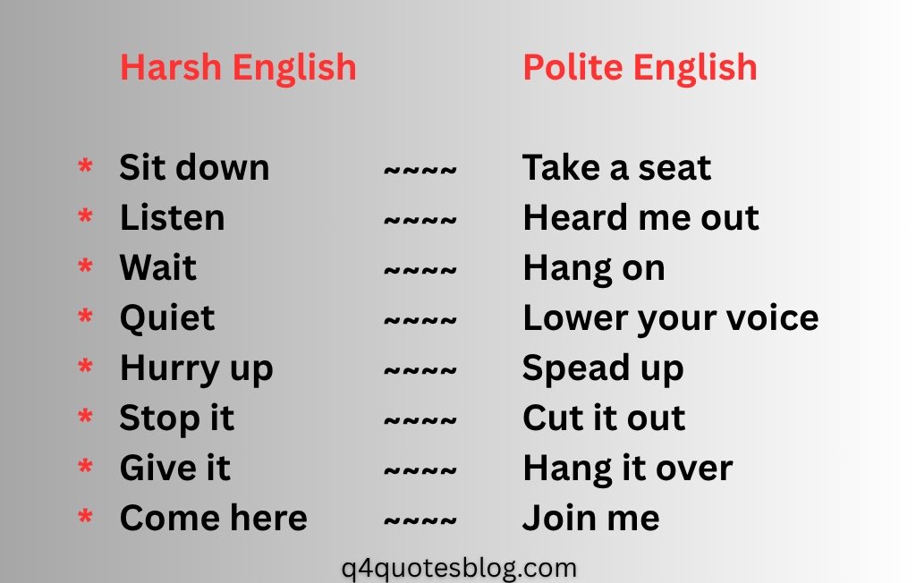 Harsh English vs. Polite English highlights the difference in tone and word choice while speaking or writing. Harsh English sounds direct, rude, or commanding, often hurting the listener’s feelings. For example, saying “Give me that” sounds forceful. In contrast, Polite English uses soft, respectful language like “Could you please give me that?” Politeness involves using words such as please, thank you, excuse me, and would you mind. It helps build better relationships and creates a positive impression. Polite language is especially important in professional, academic, and social settings. Choosing polite words shows respect, empathy, and good manners. Learning this difference improves communication and makes interactions more pleasant.
