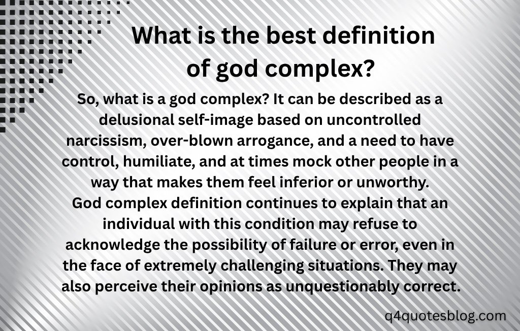 The best definition of a God complex is a psychological state where a person believes they are infallible, superior, or above the rules that apply to others. Individuals with a god complex often show extreme arrogance, lack of empathy, and an exaggerated sense of self-importance. They may believe their opinions are always right and refuse to accept criticism or advice. This mindset can develop in powerful or influential people, such as leaders, doctors, or celebrities. Unlike healthy confidence, a god complex ignores limits and accountability. It can lead to poor decision-making and damaged relationships. While not a clinical diagnosis, it is closely related to narcissistic traits. Recognizing it is key to maintaining humility and balanced thinking.